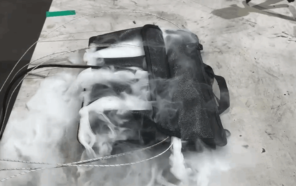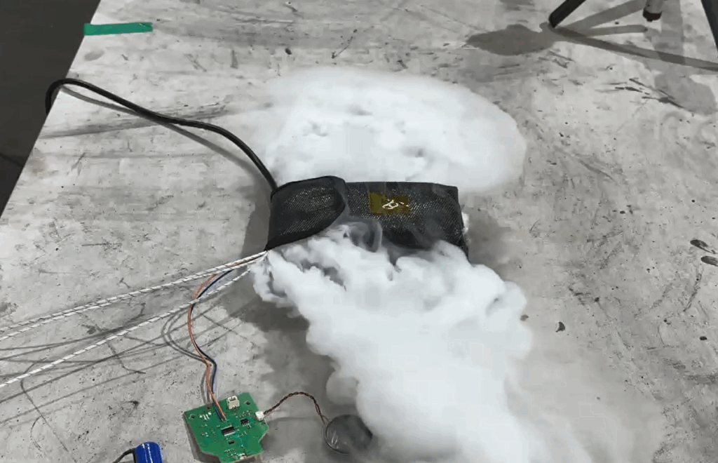 | 시험결과 | – 온도센서 및 경보장치 정상 작동 – 파우치 외부로 화염 분출되지 않음 – 속 파우치 : 부분적으로 용융됨 – 겉 파우치 : 갈라짐이나 용융 발생하지 않음 – 다용도 · 노트북용 파우치 : 노트북, 스마트폰, 전자담배 등 외관상 손상없음 |