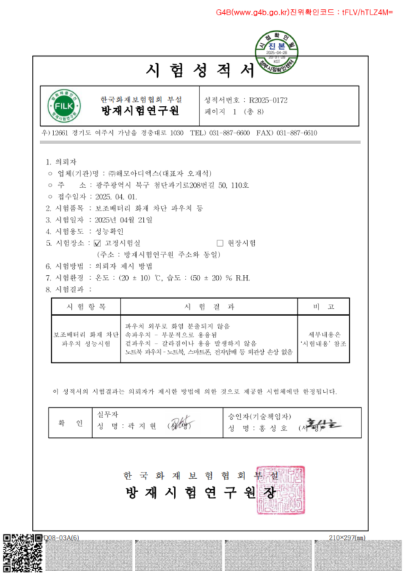| 시험항목 | 보조배터리 화재 차단 파우치 성능시험 |