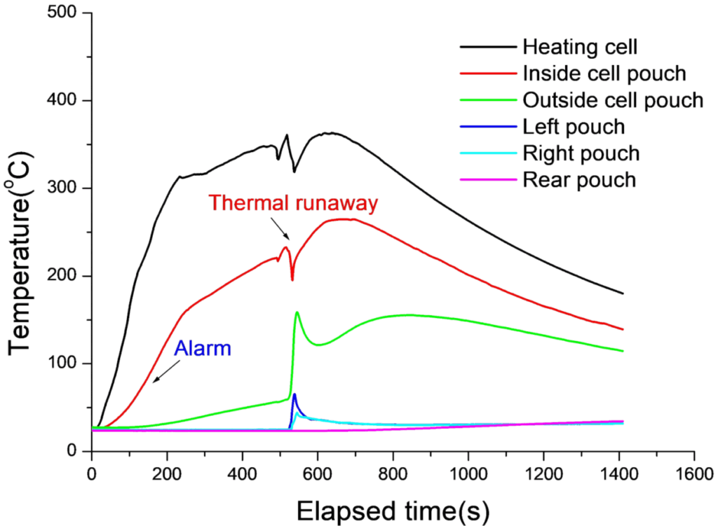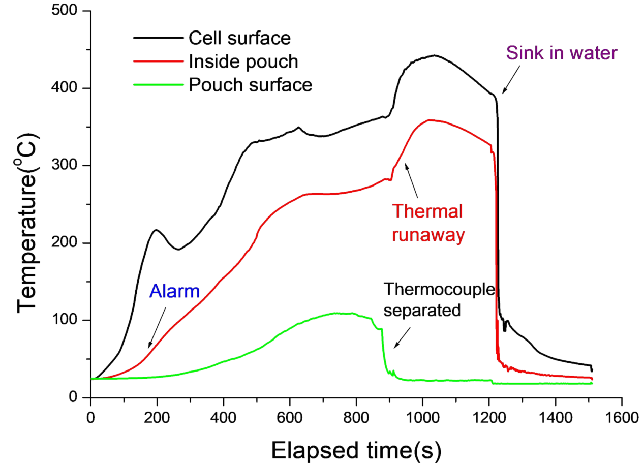 – 열 폭주 현상(온도그래프:Thermal runaway) 이후에 화염이 외부로 분출되지 않았고 시간이 경과함에 따라 파우치 내부온도와 표면온도가 내려감으로서 화재 발생을 차단함을 확인